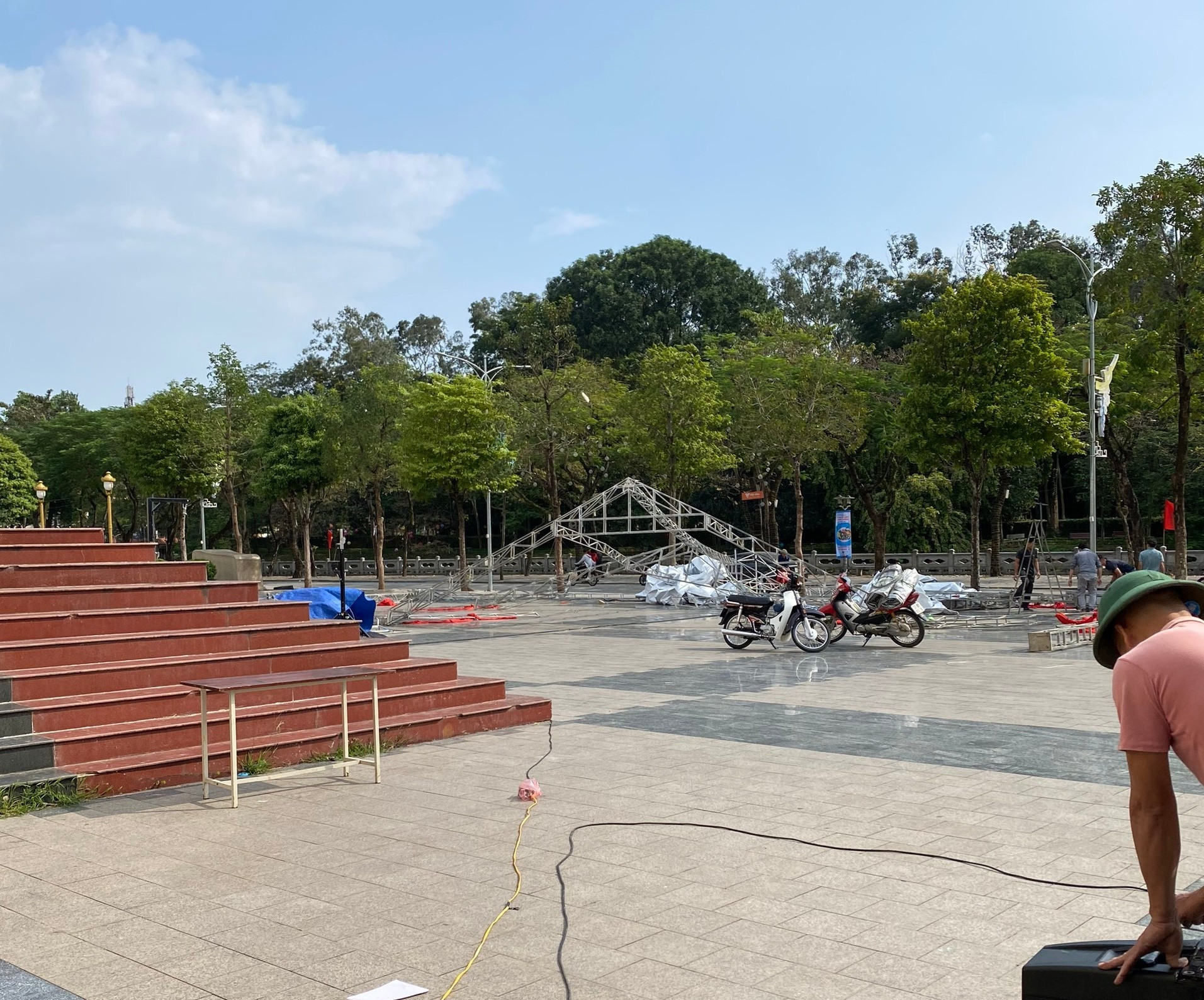 Trong sáng 16/12, sự cố tương tự cũng xảy ra tại ngoại thành Hà Nội. "Một đơn vị tổ chức sự kiện đang thi công dựng rạp tại khu vực thành cổ Sơn Tây thì gió mùa tràn về bất ngờ khiến rạp bị đổ sập. Để kịp tiến độ chương trình, họ đã phải gấp rút tháo dỡ rạp hư hỏng và dựng lại rạp mới", anh T.Đ nói.