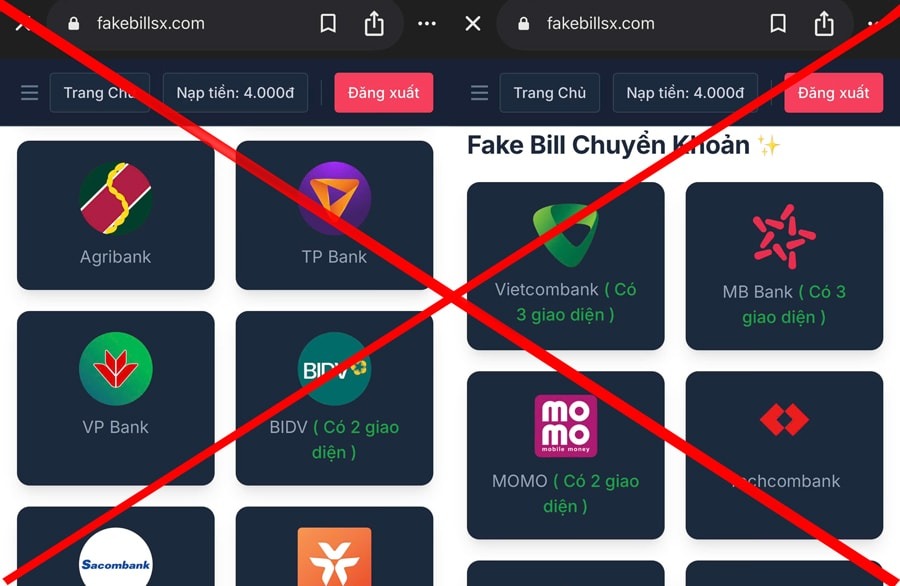 Theo hướng dẫn, ngày 1-5, phóng viên đã vào website fakebillsx.com và đăng ký tên đăng nhập, chuyển vào tài khoản NRONG THACH tại Ngân hàng Thương mại cổ phần Á Châu (ACB) số tiền tối thiểu 5.000 đồng. Sau đó, chỉ cần bấm vào mục chuyển khoản ngân hàng (auto) thì hiện lên các mẫu làm hóa đơn chuyển khoản theo nhu cầu của khách hàng. Hiện tại, website này có thể làm giả hóa đơn của 15 ngân hàng như: MB, Vietinbank, Techcombank, Momo, VP, Sacombank, VIB... Mức giá chung là 6.000 đồng/hóa đơn, riêng làm giả hóa đơn Ngân hàng MB thì phí là 9.000 đồng/hóa đơn. Chỉ chưa đầy 1 phút tạo lệnh cho mỗi hóa đơn, người ta có thể biến hóa số tiền chuyển khoản từ vài nghìn đồng đến vài chục tỷ đồng với mức phí rất thấp, 6.000-9.000 đồng/hóa đơn.
