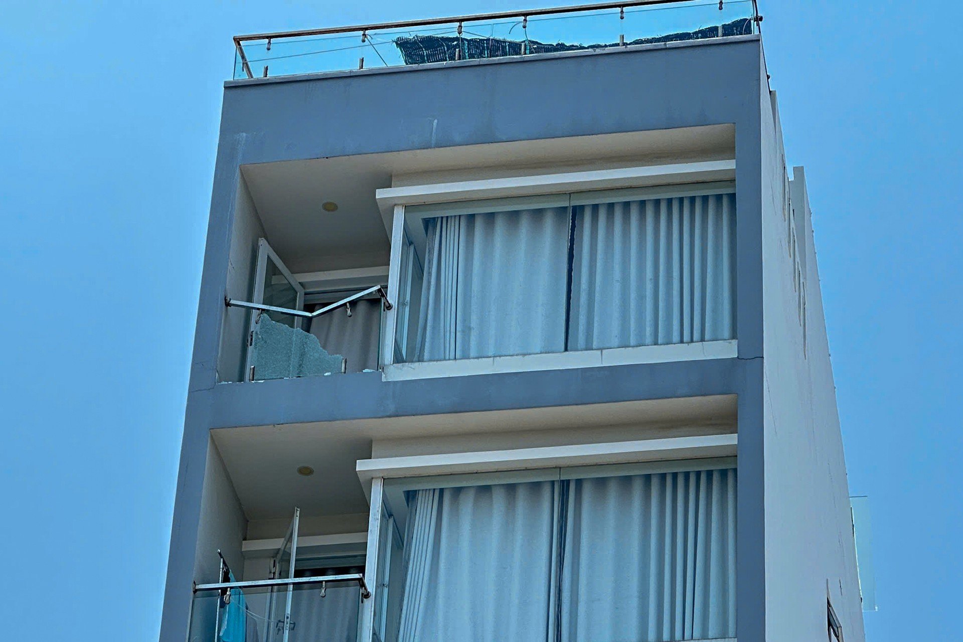 Ghi nhận tại hiện trường cho thấy phần kính ở ban công tầng 7 bị vỡ, nhiều mảnh kính rơi vương vãi phía dưới. Một số dây cáp viễn thông gần đó bị đứt, trong khi kính chắn gió của chiếc ô tô 4 chỗ đậu bên dưới cũng bị rạn nứt.