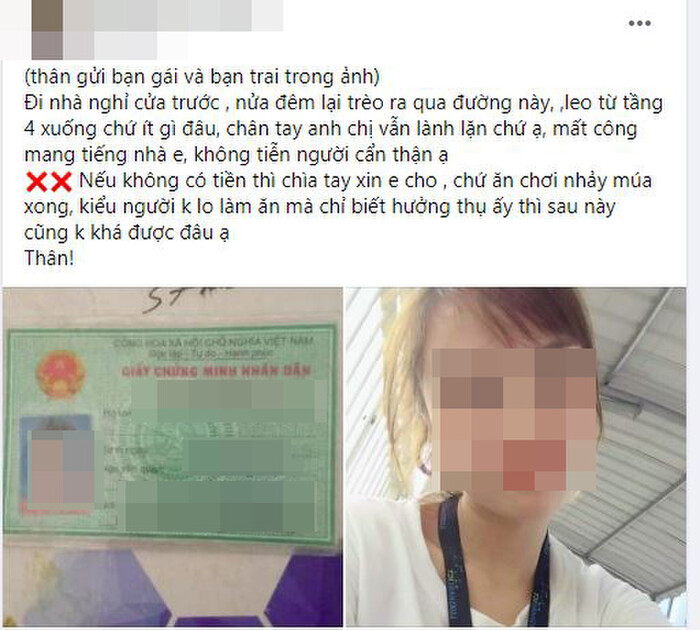 Tuy nhiên, chủ nhà nghỉ không quên “hỏi thăm” cặp đôi: “Chân tay anh chị vẫn lành lặn chứ ạ, mất công mang tiếng nhà e, không tiễn người cẩn thận ạ. Nếu không có tiền thì chìa tay xin e cho, chứ ăn chơi nhảy múa xong, kiểu người không lo làm ăn mà chỉ biết hưởng thụ ấy thì sau này cũng không khá được đâu ạ”.