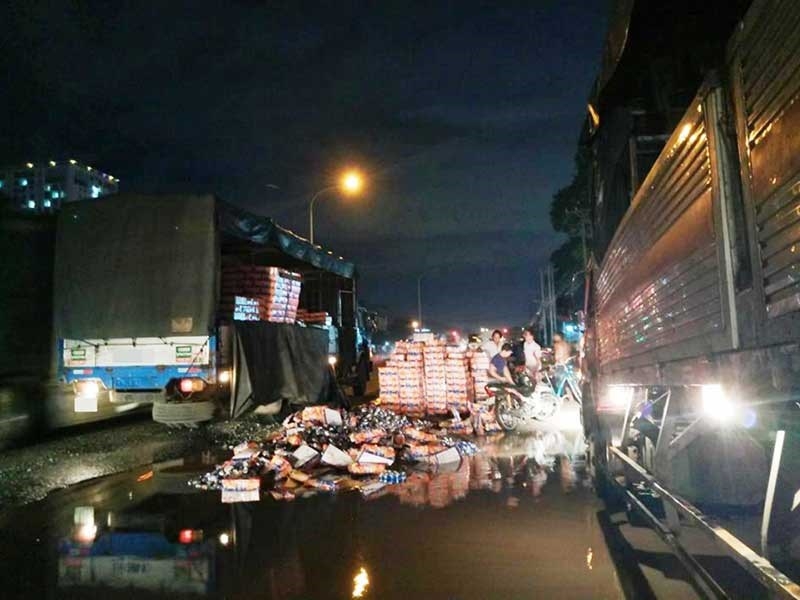 | Một xe tải chở bia bị nghiêng do mặt đường nhấp nhô làm bia đổ xuống đường. Ảnh: VŨ HỘI |