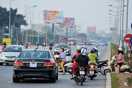 Các phương tiện khi di chuyển theo hướng Hoàng Quốc Việt tới đường Bưởi thay vì rẽ phải để lên đường vành đai 2 lại đi ngược chiều vào đường gom khiến giao thông khu vực này lộn xộn. |