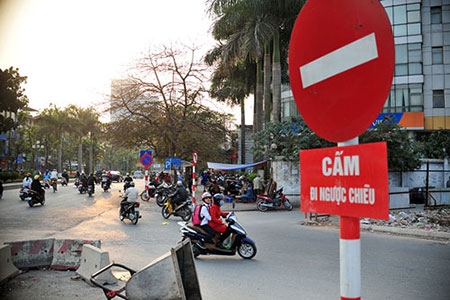 Tại điểm đầu đường Hoàng Quốc Việt, đoạn nối từ đường Vành đai 2 ra từ khi thông xe chỉ cho phép phương tiện lưu thông một chiều, rất nhiều biển báo cấm rẽ trái, cấm đi ngược chiều đã được cắm.