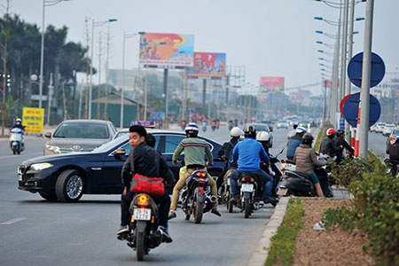 Dòng xe đi ngược chiều, đấu đầu với các phương tiện di chuyển từ hướng cầu Nhật Tân về trung tâm Hà Nội. Thậm chí cả ô tô cũng lao ngược chiều. |
