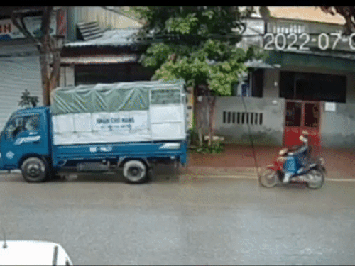 Theo camera nhà dân gần đó ghi lại cho thấy, vào thời điểm trên, một chiếc xe tải đang dừng đỗ sát lề đường, cánh cửa phía sau thùng xe mở ra buộc sát vào thành thùng. Bất ngờ một thanh niên điều khiển xe máy đi tới đâm thẳng vào đuôi xe tải.