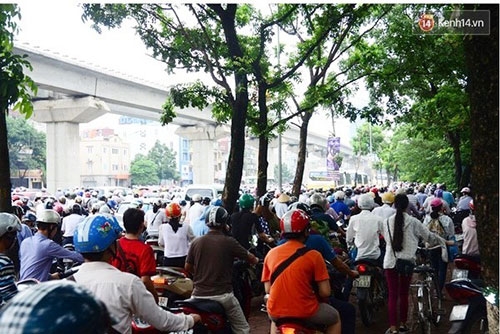 Tắc nghẽn kéo dài từ khu vực trước cổng ĐH Khoa học Xã hội và Nhân văn đến Ngã Tư Sở. Ảnh chụp vào sáng 9/9 - (Ảnh: Biện Thành). |