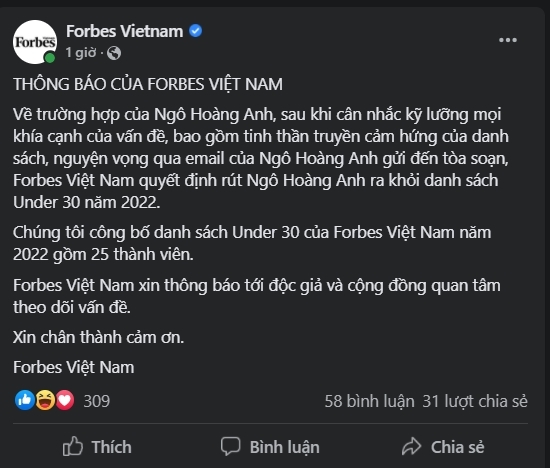 Thông báo chính thức của Forbes Việt Nam nêu rõ: "Về trường hợp của Ngô Hoàng Anh, sau khi cân nhắc kỹ lưỡng mọi khía cạnh của vấn đề, bao gồm tinh thần truyền cảm hứng của danh sách, nguyện vọng qua email của Ngô Hoàng Anh gửi đến tòa soạn, Forbes Việt Nam quyết định rút Ngô Hoàng Anh ra khỏi danh sách Under 30 năm 2022".