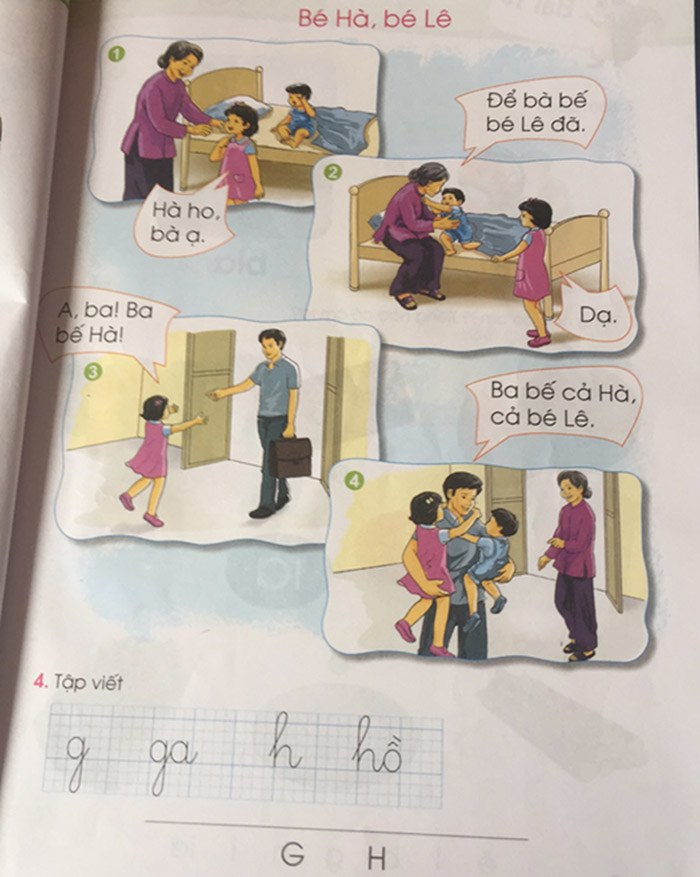 Cụ thể, trong trang sách có ba nhân vật là bà - bé Hà - bé Lê. Hà là chị của bé Lê, cậu bé vừa tỉnh dậy ngồi trên giường. Ở bức hình thứ nhất khi Hà bị ho, cô bé đã với bà rằng: "Hà ho, bà ạ". Nhưng thay vì chăm sóc Hà thì ở bức hình 2, bà lại ra dỗ cậu bé trên giường và nói: "Để bà bế bé Lê đã".