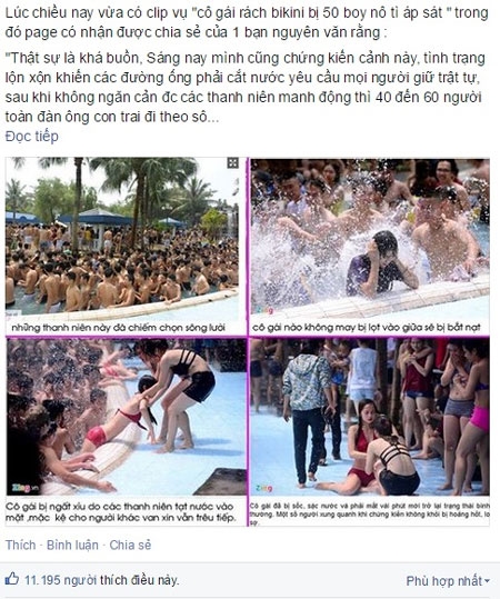 Facebook-er Cao Cực Kỳ kể lại: "Thật sự là khá buồn, Sáng nay mình cũng chứng kiến cảnh này, tình trạng lộn xộn khiến các đường ống phải cắt nước yêu cầu mọi người giữ trật tự. 40 đến 60 người toàn đàn ông con trai đi theo sông lười, gặp cô gái nào đứng 1 mình hoặc người nào đó không có bạn trai đi cùng là lôi xuống, rồi một lũ xúm lại sờ ngực bóp mông dìm người ta, có trường hợp lột trần người ta luôn. Ít nhất cũng 20 nữ sinh gặp nạn... "