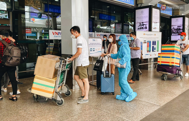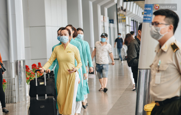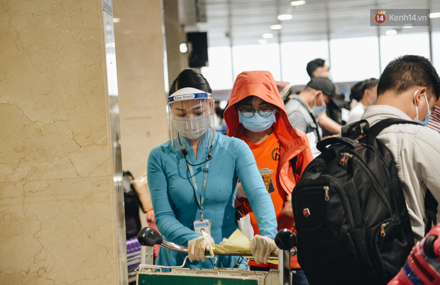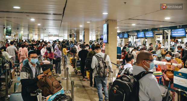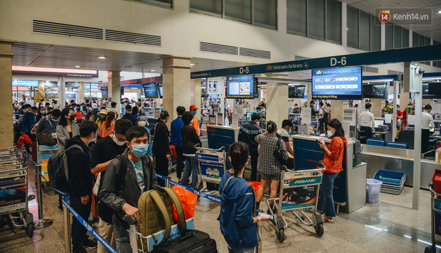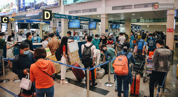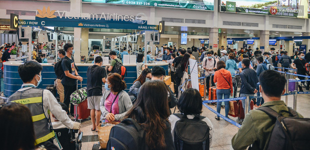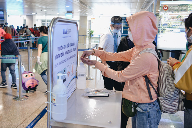 Ghi nhận, bên trong quầy làm thủ tục check in rất đông hành khách, hàng nghìn người xếp hàng nối đuôi nhau, tất cả đều mang khẩu trang để phòng dịch. Tại các lối đi của sân bay đều được bố trí nước rửa tay sát khuẩn, nhân viên mặt đất tại sân bây cũng được trang bị bao tay y tế, màn chắn ngăn giọt bắn,… để phòng dịch.