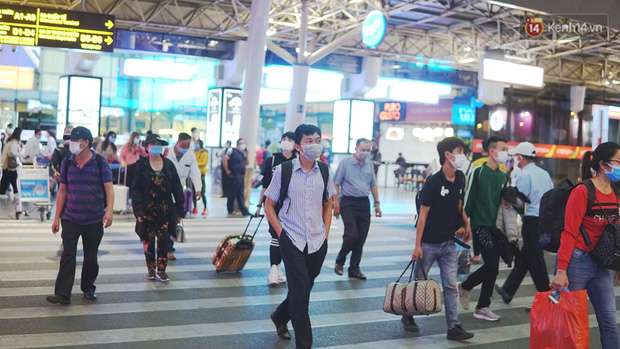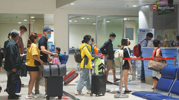 Sáng 3/12 tại Sân bay Tân Sơn Nhất, lượng hành khách có mặt tại đây vẫn đông đúc như thường nhật. Nếu như những ngày trước vẫn có hành khách chủ quan không thực hiện các biện pháp phòng dịch thì giờ đây, tất cả đều đã đeo khẩu trang kín mít, khi xếp hàng cũng chủ động giãn cách.