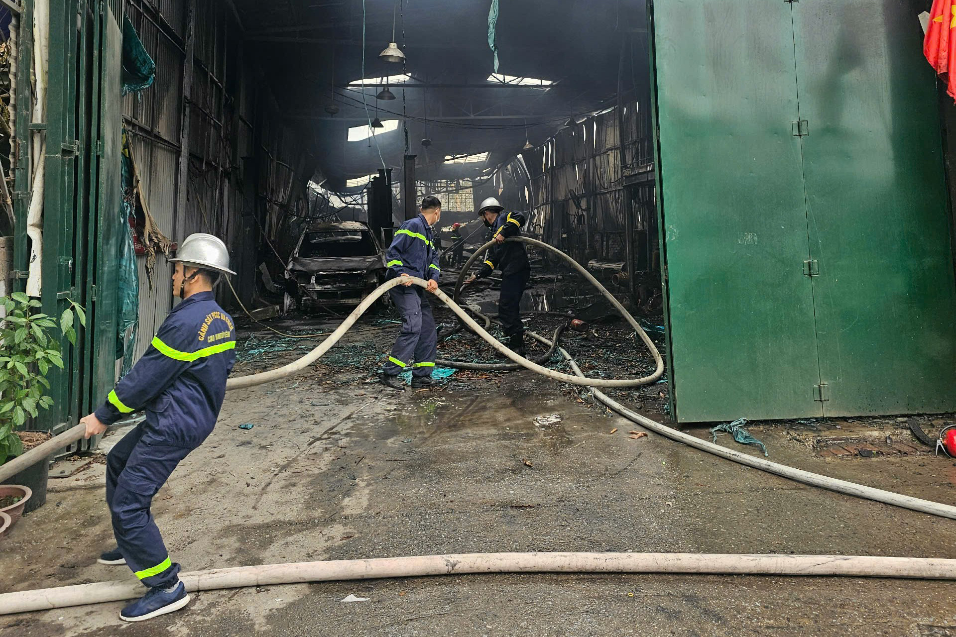 Tại hiện trường, lửa cháy to, lan nhanh qua 3 - 4 nhà xưởng gồm: Sửa chữa ô tô, đồ nội thất, in biển quảng cáo, nhà chứa cốt pha...