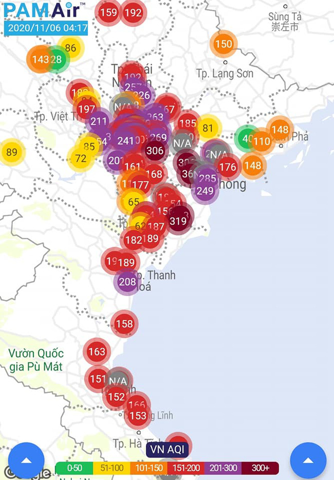 PAMAir ghi nhận chỉ số AQI ở hầu khắp Hà Nội và các tỉnh, thành phố Thái Nguyên, Bắc Ninh, Bắc Giang, Hải Dương, Hưng Yên, Hà Nam, Ninh Bình, Hải Phòng có mức đỏ, tím, không tốt cho sức khỏe - chỉ số AQI cao nhất 289, thậm chí có 8 điểm quan trắc ở mức nâu (301 - 390), gồm: điểm Ngọc Thụy, Long Biên, Hà Nội; điểm Đồng Phúc, Châu Khê, Bắc Ninh, hai điểm ở tỉnh Hưng Yên là Tam Nông (Tiên Lữ), Giã Cầu (Yên Mỹ), , 2 điểm ở Thái Bình là An Bài (Quỳnh Phụ) và Trường Tiểu học Thụy An (Thái Thụy), 2 điểm ở Nam Định là Xuân Ninh (Xuân Trường) và Thư viện huyện Hải Hậu (Hải Hậu).