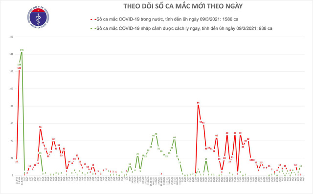Tính từ 18h ngày 08/3 đến 6h ngày 09/3, Việt Nam không ghi nhận ca mắc mới COVID-19. Cả nước hiện vẫn có 2.524 bệnh nhân COVID-19, trong đó có tổng cộng 1585 ca mắc COVID-19 do lây nhiễm trong nước, riêng số lượng ca mắc mới tính từ ngày 27/1 đến nay: 893 ca.