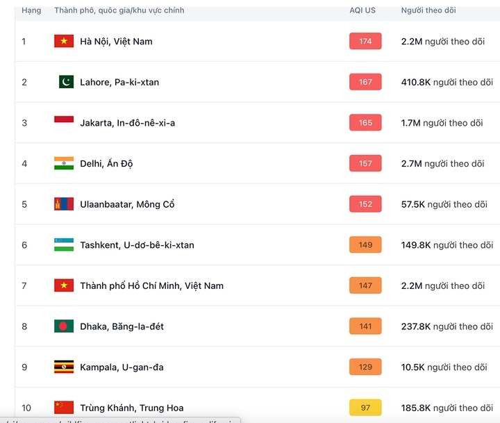 Theo dữ liệu của trang IQAir, sáng nay 7/10, Hà Nội và TP.HCM nằm trong top những thành phố lớn ô nhiễm nhất thế giới.