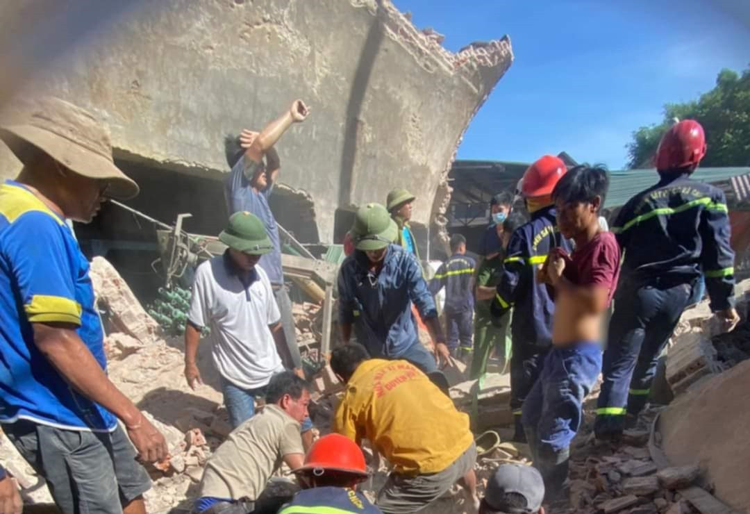 Khoảng 8h, một phần nhà kho cấp 4 rộng khoảng 100 m2, lợp mái tôn ở xã Ninh Vân bất ngờ đổ sập, tạo tiếng động lớn, bụi bay mù mịt. Những bức tường cao khoảng 3 m vùi lấp ba người đang làm việc.