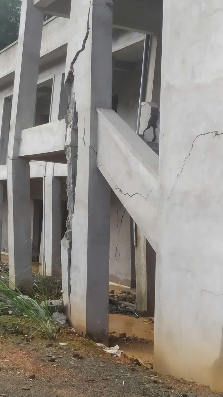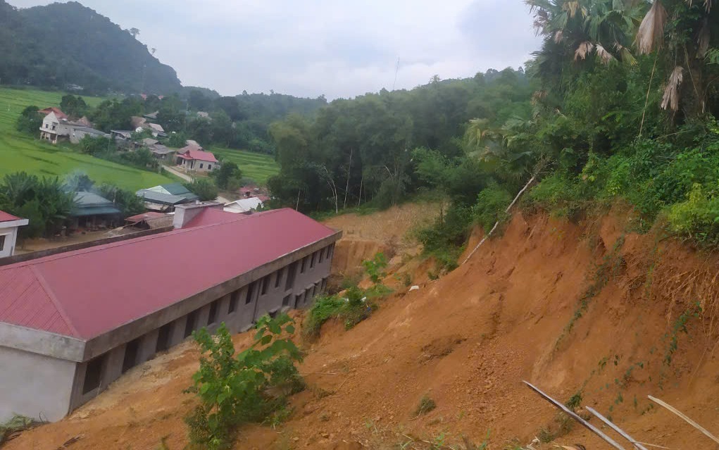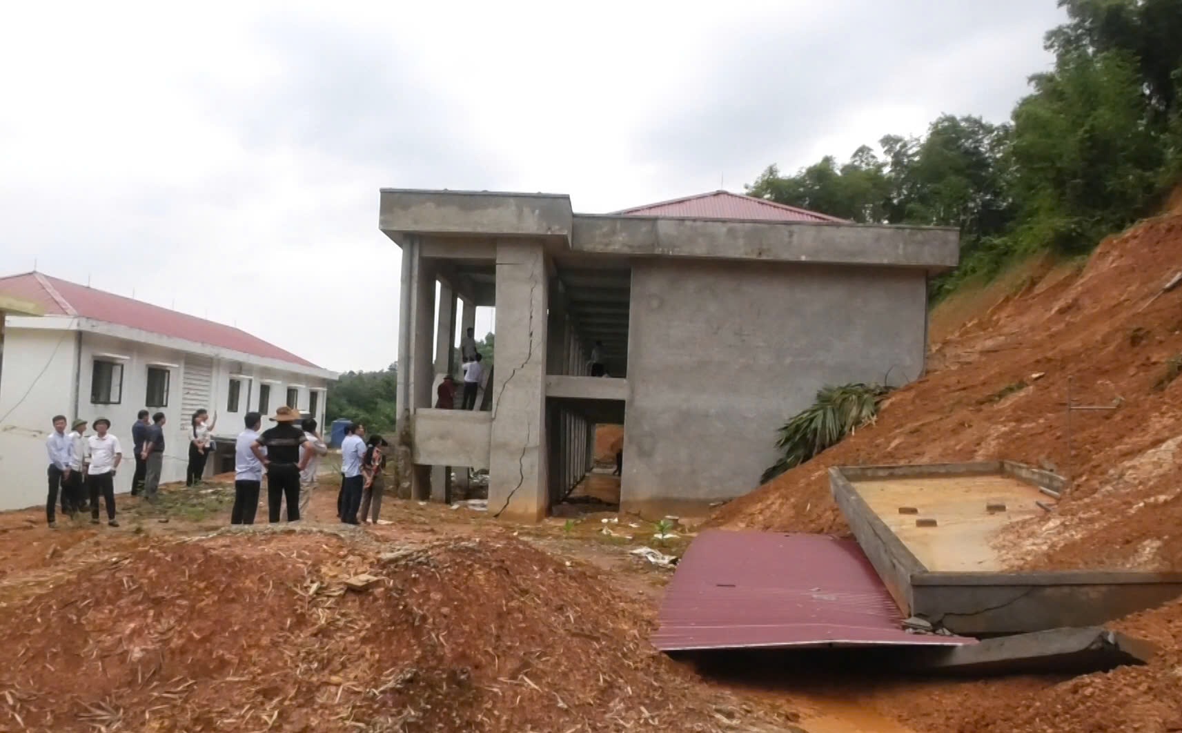 Sạt lở đất đã khiến công trình trường học 2 tầng đang xây dựng (hoàn thiện 80%) bị hư hỏng, xô nghiêng, nhiều vị trí tường bị nứt rộng 5-7 cm; một số cột bị cong, gãy bên trái tầng một; hai phòng học bị đất tràn xuống làm đổ, sập một phần tường…