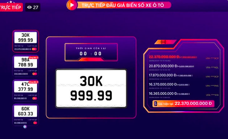 Theo đó, tại khung giờ đấu giá từ 10 giờ đến 10 giờ 25 cùng ngày, biển số 30K-999.99 đã được đấu giá thành công, với mức trúng đấu giá hơn 22,3 tỉ đồng.