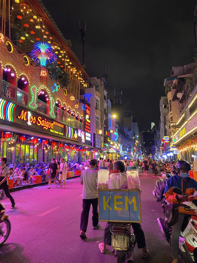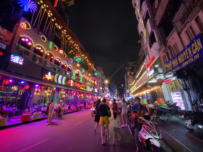 Ngược lại hàng quán trên phố đi bộ Bùi Viện (quận 1) rất náo nhiệt về đêm. Đường sá đông đúc, quán ăn chật kín khách trong tiếng nhạc sàn đinh tai nhức óc.