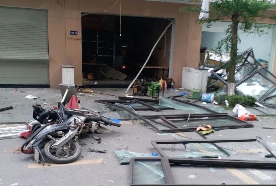 Tại hiện trường, khu vực đường trước căn nhà liền kề phát ra tiếng nổ có la liệt các mảnh kính lớn, vỡ vụn. Một chiếc xe máy đỗ phía trước bị biến dạng.