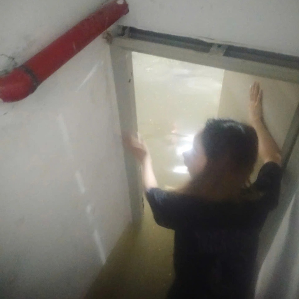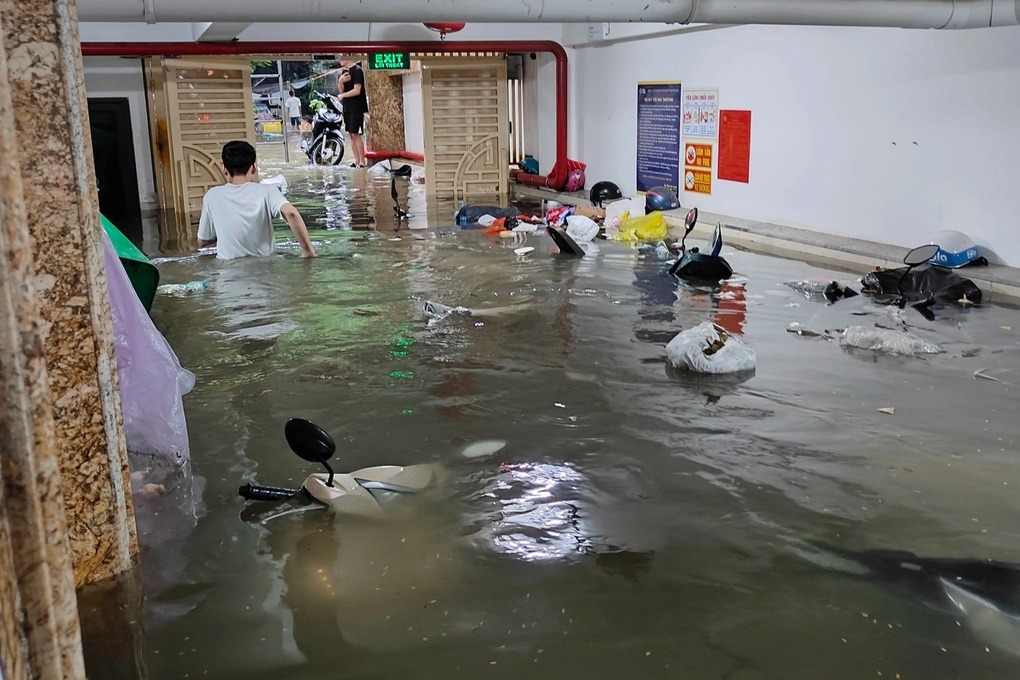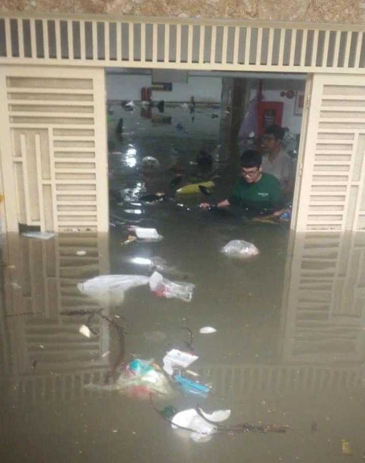 "Có khoảng 60-70 chiếc xe máy của sinh viên, người dân thuê trọ tại đây chìm nghỉm trong nước. Nước ngập nửa tầng hầm để xe. Thang máy không hoạt động, chúng tôi đã gọi chủ nhà nhưng không thể liên lạc", chị Sinh nói.