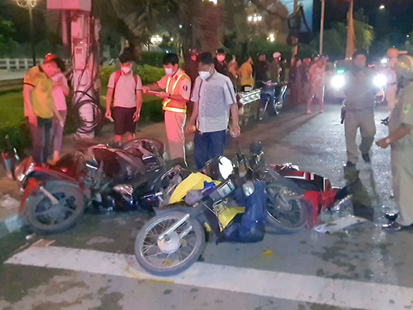 Cú tông mạnh khiến 4 xe máy nằm ngổn ngang trên đường. Ông Bình và một phụ nữ bị thương được người dân đưa đi bệnh viện cấp cứu.