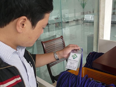 Muốn vào showroom khách phải đeo những tấm thẻ có chữ Trung Quốc này (ảnh Đình Thiên) |