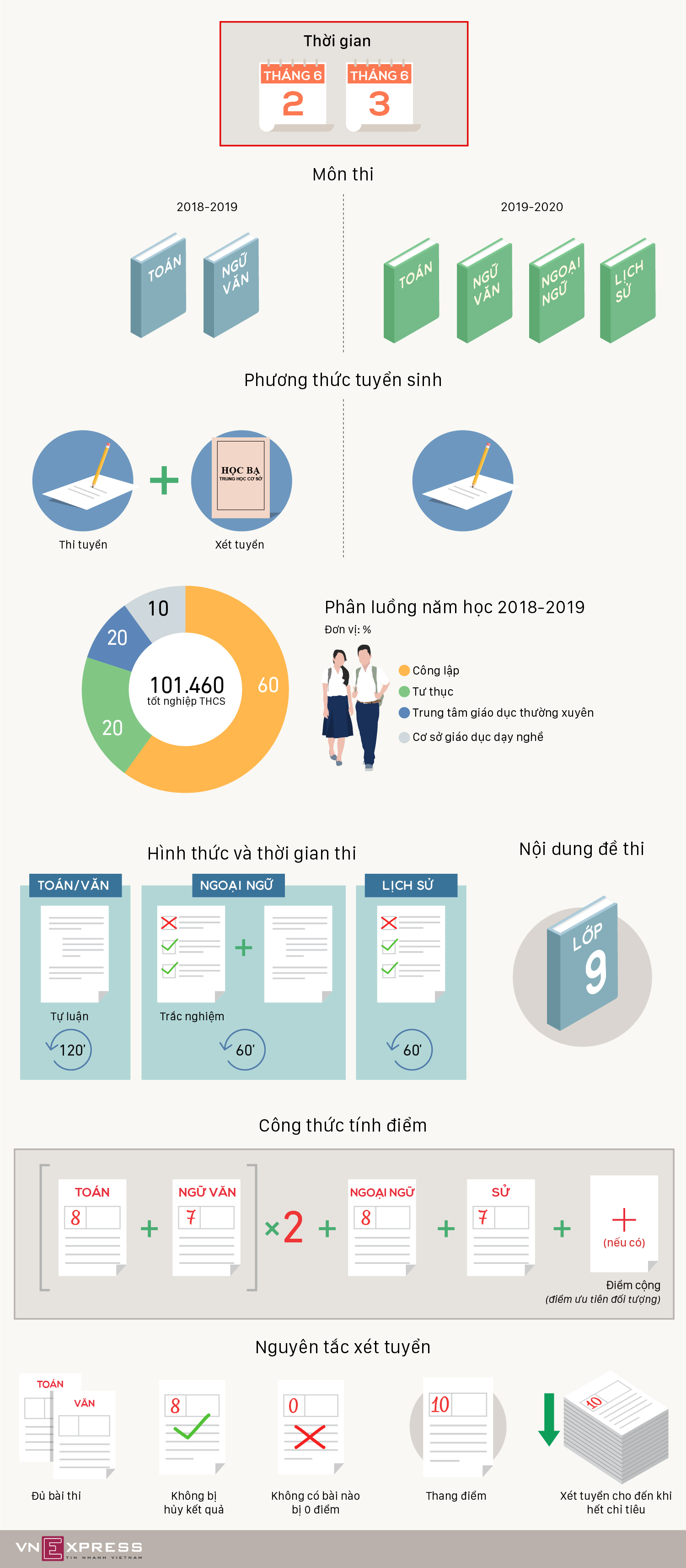 Sau mấy chục năm chỉ thi Toán, Ngữ văn, năm nay lần đầu tiên thí sinh sẽ thi 4 môn gồm Toán, Ngữ văn, Ngoại ngữ và Lịch sử. Trong đó Toán, Ngữ văn là tự luận, Ngoại ngữ kết hợp trắc nghiệm và tự luận, Lịch sử thi trắc nghiệm.