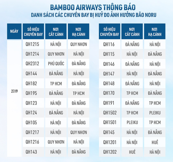 Cụ thể, Vietnam Airlines phải huỷ 106 chuyến bay đi đến 5 sân bay buộc phải đóng cửa. Trong số này, nhiều nhất là các chuyến bay đi/đến Đà Nẵng (70 chuyến); Phú Bài (16 chuyến), Chu Lai (12 chuyến), Pleiku (4 chuyến) và Phù Cát (4 chuyến). Ngoài ra, một số chuyến bay khác cũng sẽ bị ảnh hưởng dây chuyền do lịch khai thác thay đổi.