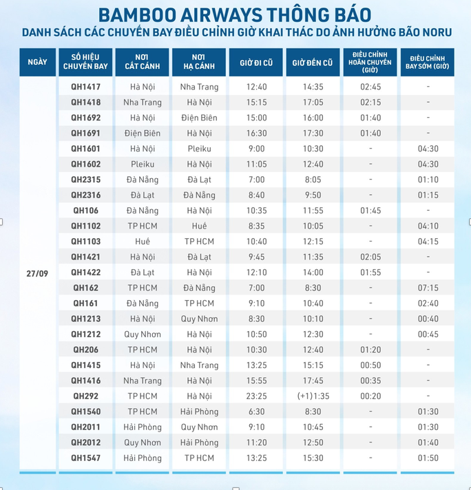 Hãng hàng không Bamboo Airways phải hủy khai thác 24 chuyến bay, đồng thời điều chỉnh kế hoạch khai thác 25 chuyến bay khác.