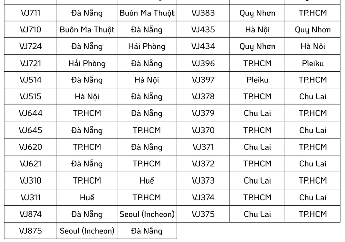 Danh sách các chuyến bay bị huỷ của Vietjet: