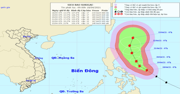 Theo tin từ Trung tâm Dự báo Khí tượng thủy văn Quốc gia, siêu bão Surigae đang hoạt động trên vùng biển phía Đông Philippines với sức gió cấp 17, giật trên cấp 17.