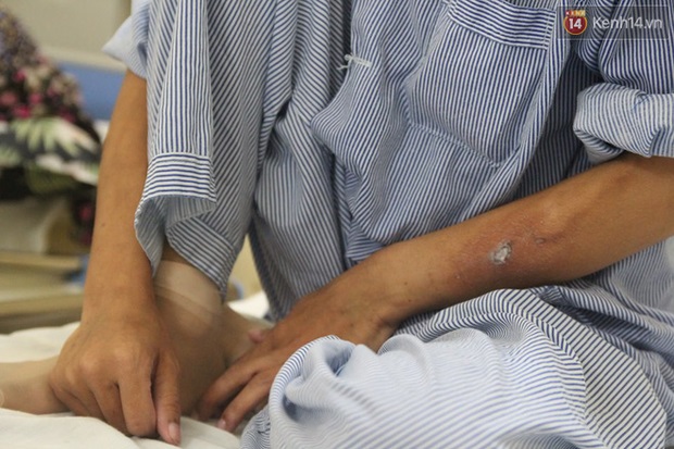 Từ một người mẹ xinh xắn, giờ đây tay chân Thanh gân guốc, đầu cạo trọc, đôi mắt trũng sâu và thâm đen, trên cơ thể xuất hiện nhiều những nốt lở loét do tác dụng phụ của hóa chất.