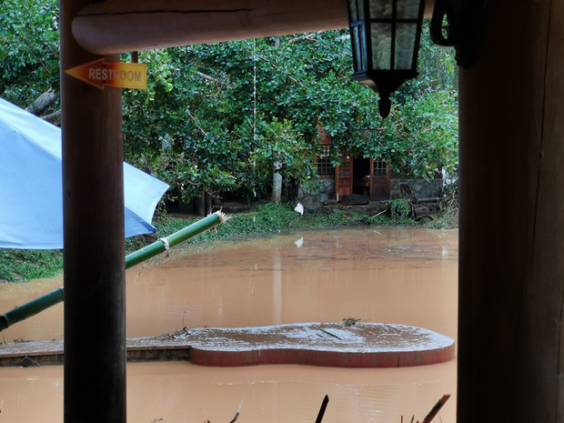 12h nước vẫn còn dâng hơn 1m. Toàn bộ cầu treo đã bị lũ cuốn trôi, 2 đứa cùng toàn bộ mọi người trong KDL bị cô lập, điện nước bị cắt, nước ngọt không còn, chỉ biết hứng nước mưa để dùng.