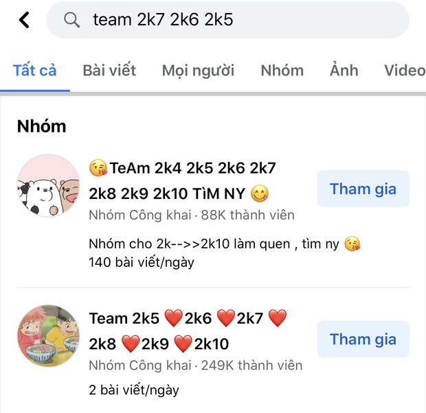 Chỉ cần search bất cứ con số nào trong dãy số từ 2k1 - 2k14 trên Facebook, kết quả thu về sẽ là một dãy dài dằng dặc, dễ đến 8 vạn group. Quy mô của những group này cũng trải dài từ lớn đến bé, từ vài trăm đến hàng trăm nghìn thành viên. Các group luôn ở trong trạng thái mở toang, câu kéo được càng nhiều người tham gia càng tốt và chứa các nội dung tương tự Team 2k9.