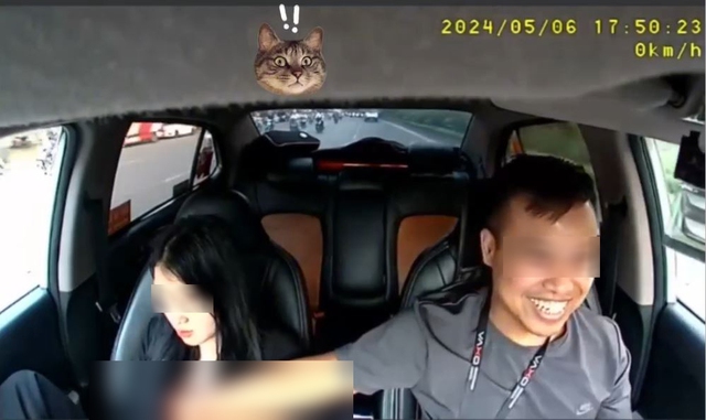 Một clip có ghi chú thời gian vào khoảng 17h50 ngày 6/5/2024, khi ô tô đang lưu thông trên đường, xung quanh xe cộ nườm nượp. Nam tài xế mặc áo xám chỉ đặt một tay trên vô lăng, tay còn lại đặt lên người phụ nữ ngồi bên ghế phụ.