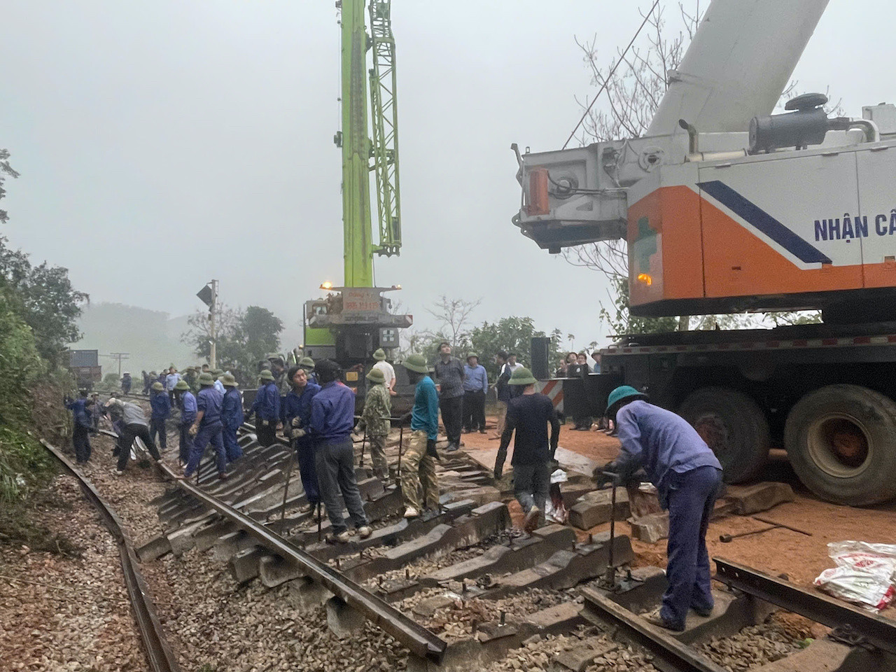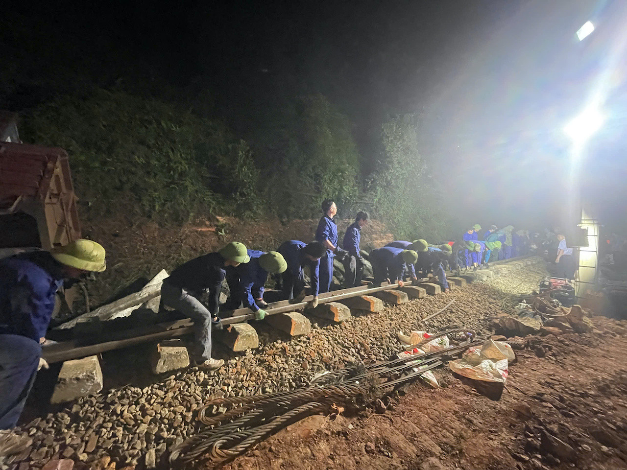Sau khi tuyến đường sắt Bắc - Nam tê liệt sau vụ lật tàu hàng tại Đức Liên, Vũ Quang, Hà Tĩnh, hàng trăm công nhân đường sắt xuyên đêm khắc phục sự cố, dự kiến sáng nay thông tàu.