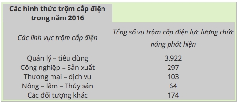 Ông Lê Quang Đức - Phó Trưởng ban Thanh tra - Bảo vệ (Tập đoàn Điện lực Việt Nam – EVN) cho biết, trong năm 2016, các đơn vị thuộc EVN đã rà soát và kiểm tra trên 3,37 triệu lượt khách hàng sử dụng điện và phát hiện 4.560 vụ trộm cắp điện với sản lượng điện truy thu lên đến hơn 15,9 triệu kWh, tương ứng 45,237 tỷ đồng. Số vụ có giảm hơn so với các năm trước, nhưng hình thức trộm cắp điện lại tinh vi và khó phát hiện hơn.