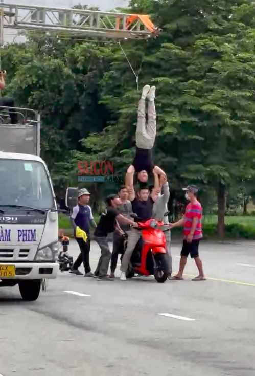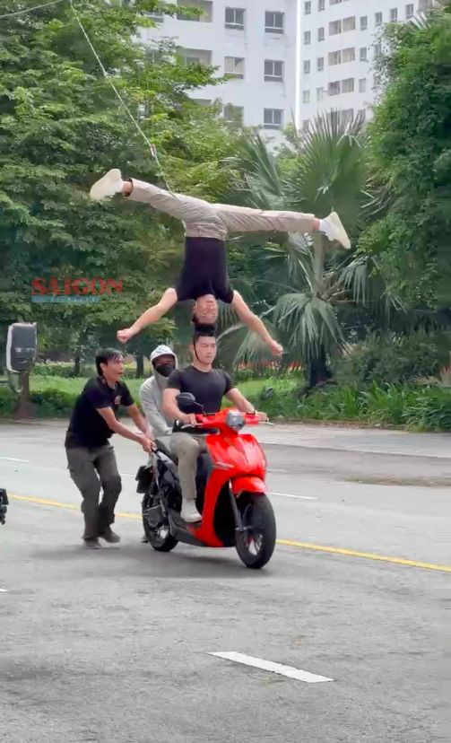 Một đoạn clip hậu trường cho thấy, hai nghệ sĩ vừa chạy xe vừa xiếc chồng đầu đều có sự giám hộ, bảo hộ kỹ lưỡng của các thành viên đoàn làm phim. Trước khi biểu diễn tư thế trên, nghệ sĩ chồng đầu từ trên xuống được buộc dây an toàn vào người và di chuyển cũng cực kỳ chậm.