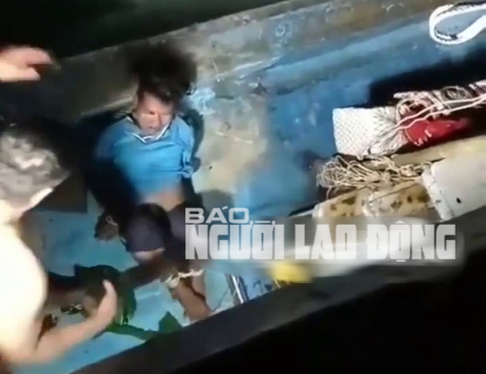 Hình ảnh từ clip đăng tải trên mạng xã hội cho thấy 2 người đàn ông đánh, đá và trói 1 người đang nằm trên chiếc ghe đang di chuyển trên biển. Trong khi đó, nam thanh niên bị đánh chỉ biết dùng chân chống đỡ do 2 tay bị trói ra phía sau.