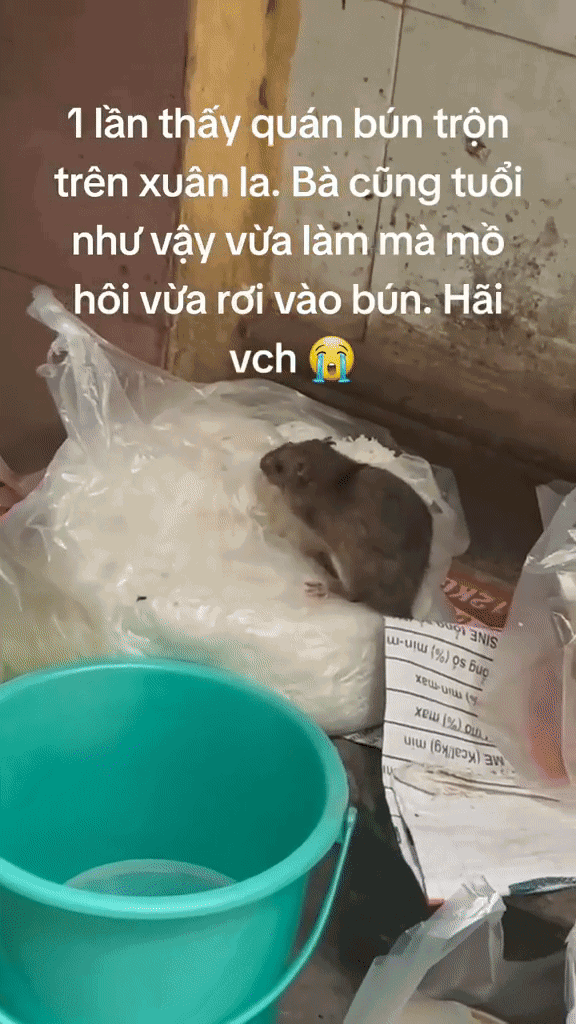 Theo đoạn clip ghi lại, người bán hàng khá lớn tuổi bày biện hàng quán của mình đơn sơ, túi bún và một số vật dụng khác được để ngay dưới nền gạch. Đáng chú ý, trong lúc người bán mải mê làm món bún trộn thì túi bún để dưới nền gạch có một con chuột bò lên ăn ngon lành.