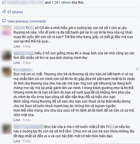 Khi trả lời các thắc mắc của bạn bè trên facebook, Trâm cho biết đã nhờ công an và chính quyền địa phương tìm cha bé nhưng không có thông tin gì. Trâm còn chia sẻ rằng mình đã gửi đơn xin nhận nuôi bé và cho biết được hẹn ngày 3/6 mới có giấy tờ hợp pháp gửi đến. Những khẳng định này khiến nhiều người tin hoàn toàn vào câu chuyện của Trâm và cảm thương cho đứa bé là "con của người tử tù".