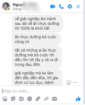 “Thường những gia đình có người bị ung thư đều là do nghiệp âm hành cả. Bây giờ em làm theo cách này trước, em nạp 200 nghìn đồng thẻ điện thoại vào số 09754199xx của cô đồng Hoa, sau đó em gọi cho cô ấy, hỏi cô ấy về trường hợp bé nhà em, nếu bé không bị nghiệp âm hành, thì việc ăn thực dưỡng không vấn đề.