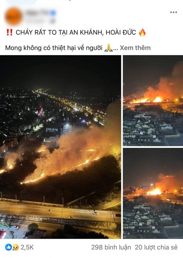 Bài viết đăng tải với nội dung: "Cháy rất to tại An Khánh, Hoài Đức. Mong Không có thiệt hại về người", kèm theo hình ảnh đám cháy lớn được chụp từ xa khiến nhiều người hoang mang, lo lắng.
