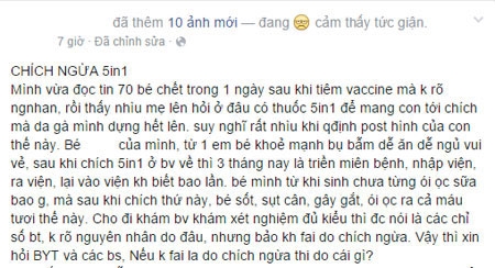 Theo chia sẻ của một bà mẹ có tên nick là N.Tran. Chị cho biết, trong thời gian 3 tháng sau khi tiêm vắc xin Quinvaxem, con của chị quấy khóc, sốt và sụt cân thậm chí nôn ra máu.