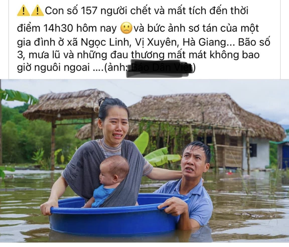 Bức ảnh trên còn được chia sẻ kèm theo dòng tiêu đề: "Nghẹn lòng hình ảnh sơ tán của một gia đình ở xã Ngọc Linh, Vị Xuyên, Hà Giang... Bão số 3, mưa lũ và những đau thương mất mát không bao giờ nguôi ngoai".