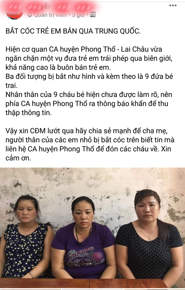 Thông tin được chia sẻ kèm theo hình ảnh 3 người phụ nữ và 9 bé trai. Thậm chí, người đăng tải còn cho rằng, do nhân thân của 9 cháu bé chưa được làm rõ nên Công an huyện Phong Thổ ra thông báo khẩn để thu thập thông tin, đồng thời tìm người nhà của các nạn nhân…