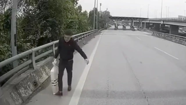 Sau đó, do đang lưu thông trên cao tốc nên chị Vân không thể dừng xe ngay mà phải tấp vào làn khẩn cấp để kiểm tra. Khi hỏi thăm các phương tiện đi qua, một tài xế xe tải cho biết có người đi xe màu đen vừa nhặt bao tải.