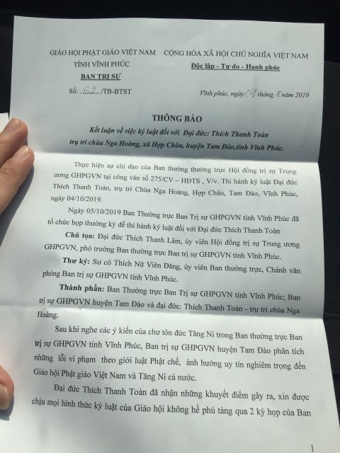 Trong đoạn clip được đăng tải trên mạng xã hội mới đây đã ghi lại cảnh sư Thích Thanh Toàn giải trình với Giáo hội Phật giáo Việt Nam tỉnh Vĩnh Phúc.