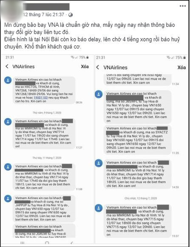 "Mấy ngày nay nhận thông báo thay đổi giờ bay liên tục đó. Điển hình là tại Nội Bài còn không báo delay, lên chờ 4 tiếng xong rồi báo hủy chuyến. Khổ thân khách quá cơ."